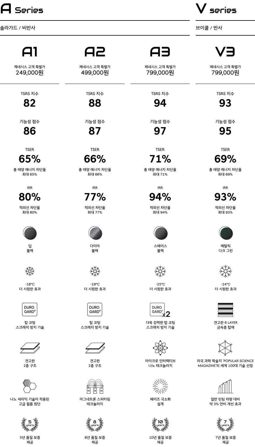 * TSR은 자외선·적외선·가시광선 등의 복합 열에 대한 필름의 총 평가 요소인 기준입니다. 시인성, 내구성, 시공성과 브랜드 가치 등 다양한 요소를 고려하여 수치화한 틴팅 필름 종합지수입니다.